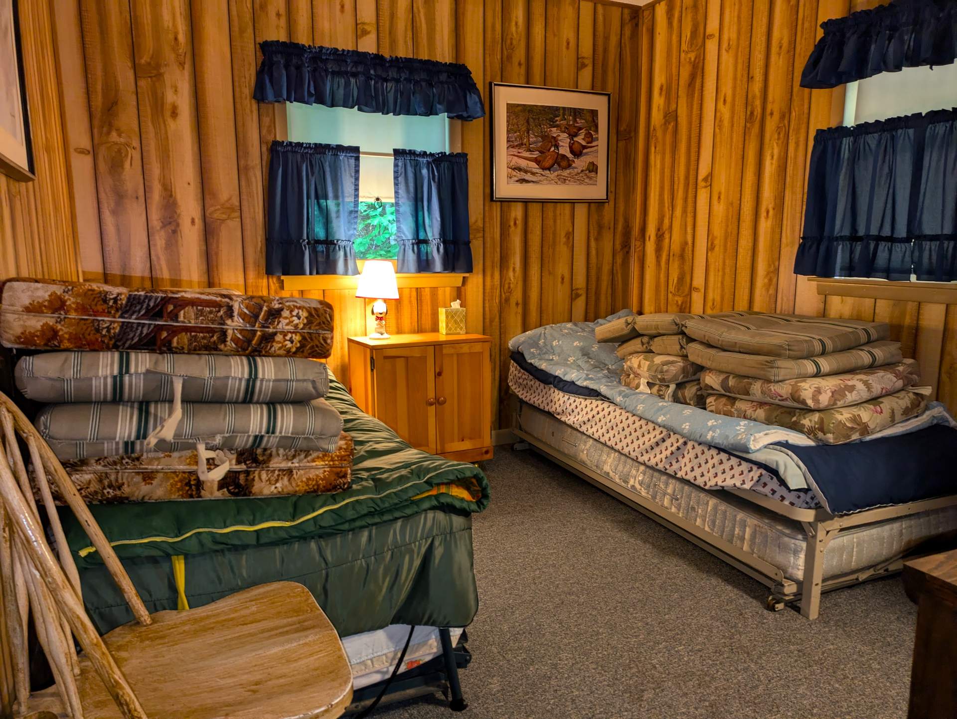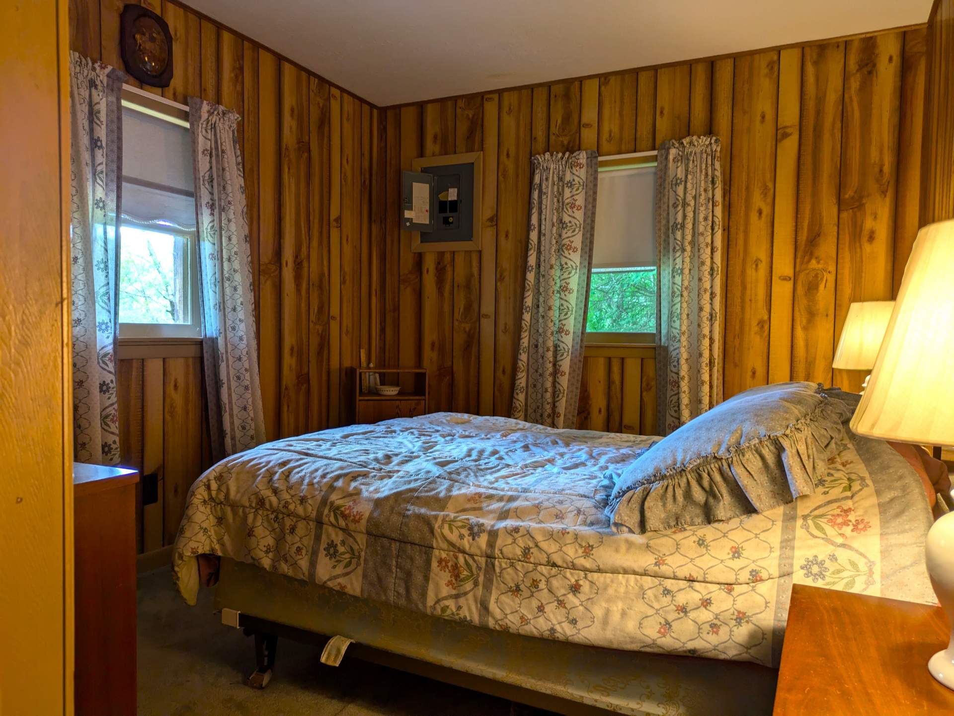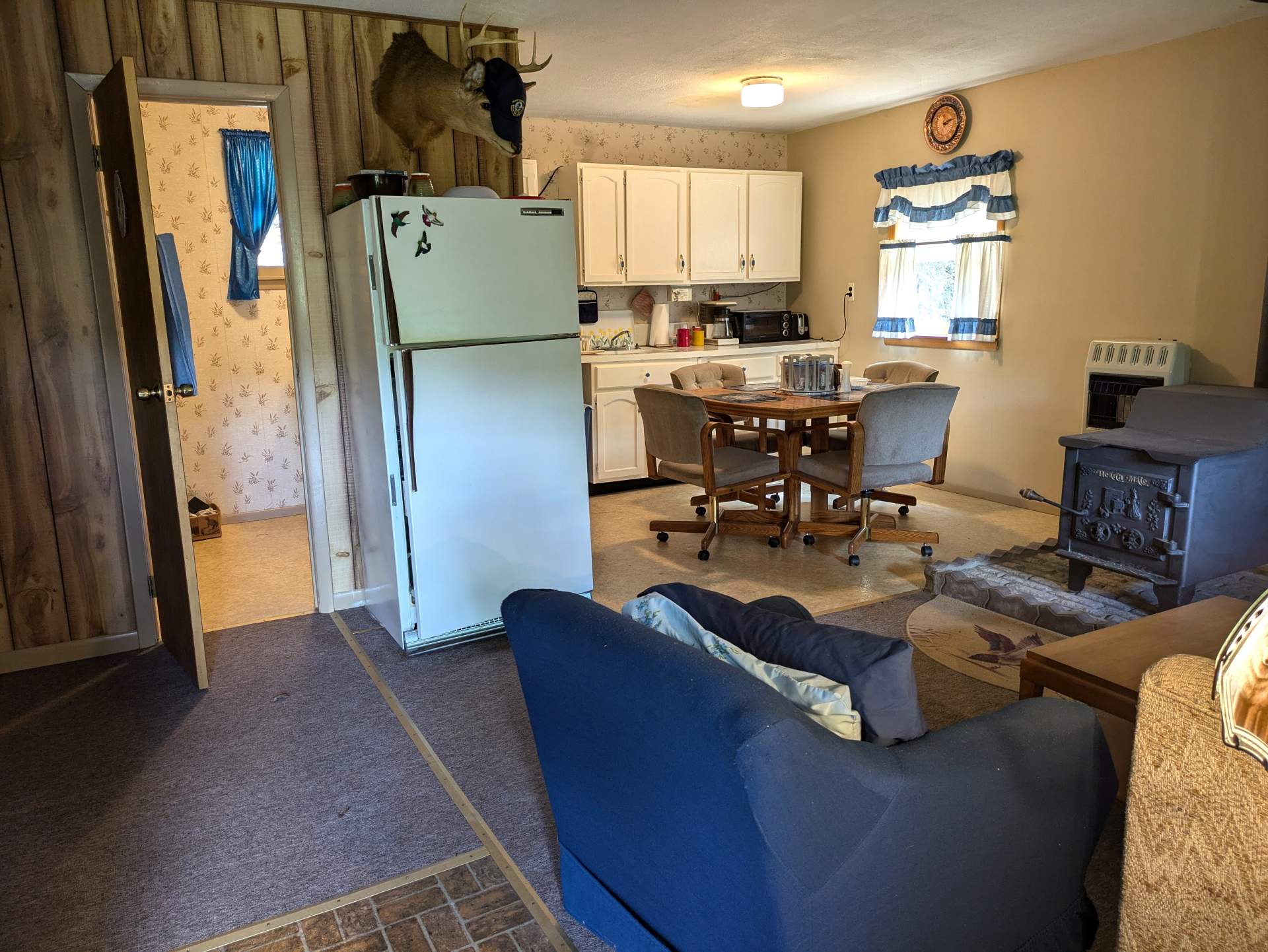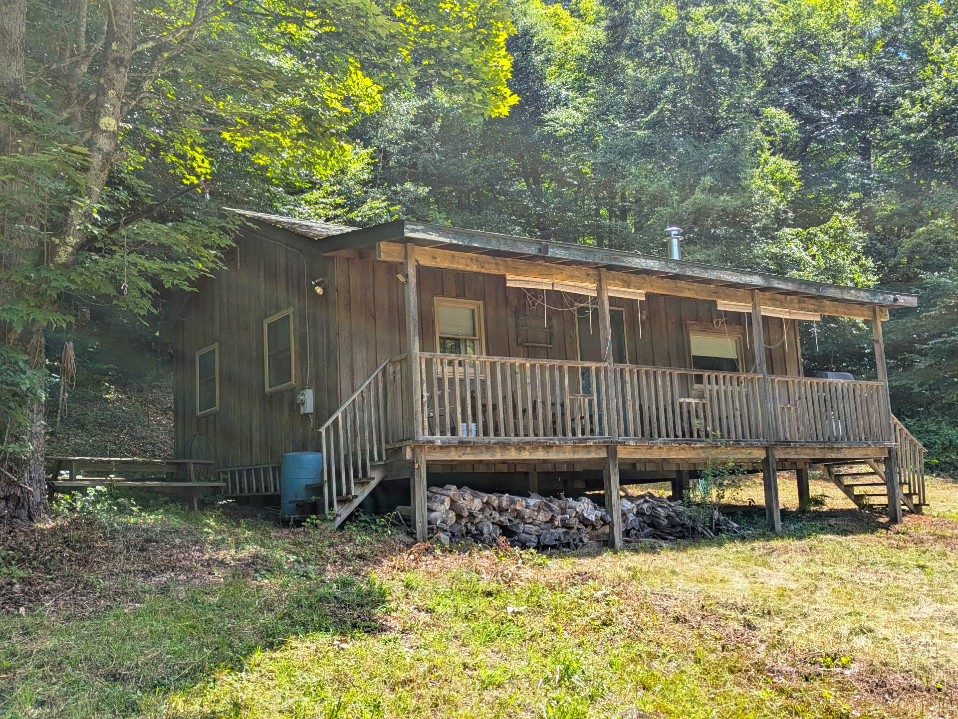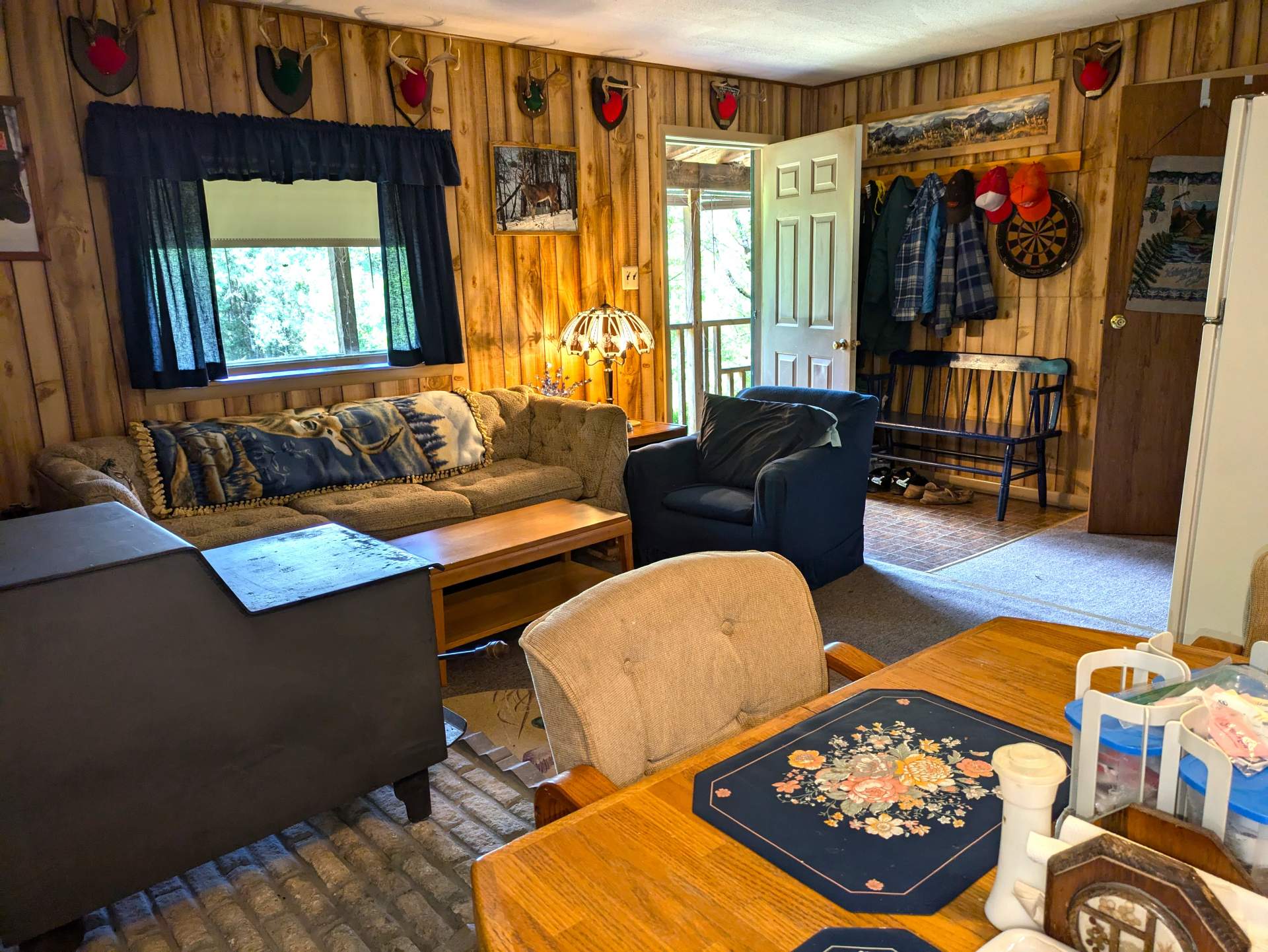 Built in 1990, the cabin features two bedrooms and a bathroom, with a combined living room and kitchen that create a warm, inviting atmosphere. Spend your summer evenings on the cozy covered front porch, or enjoy the charm of the beautiful wood stove, complemented by a backup propane heater for added comfort. The property is equipped with a modern septic system and a spring that provides gravity-fed water to a holding tank.