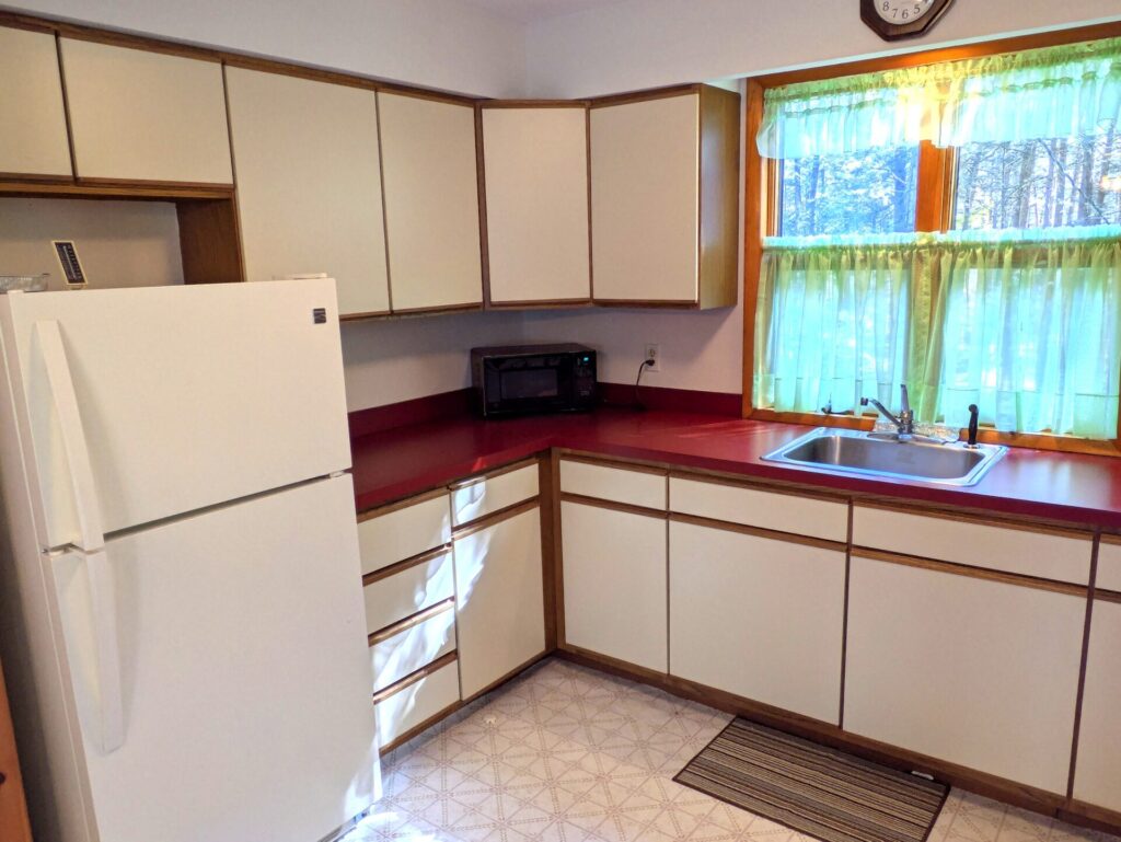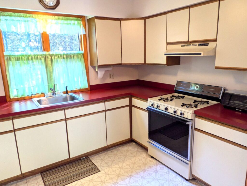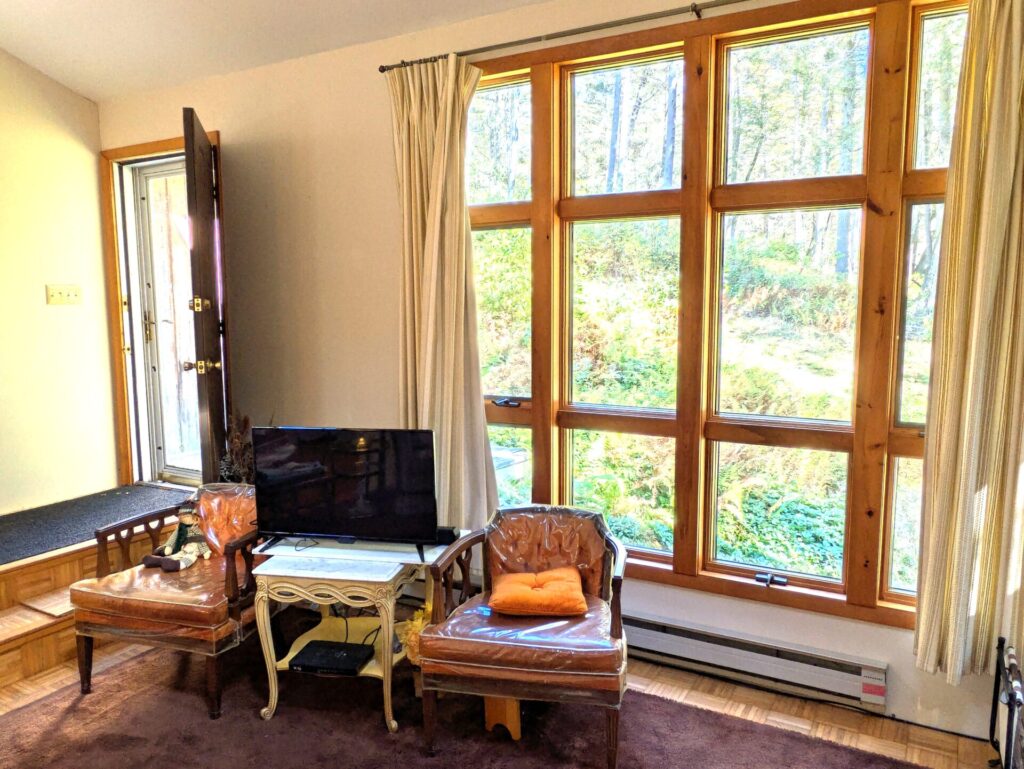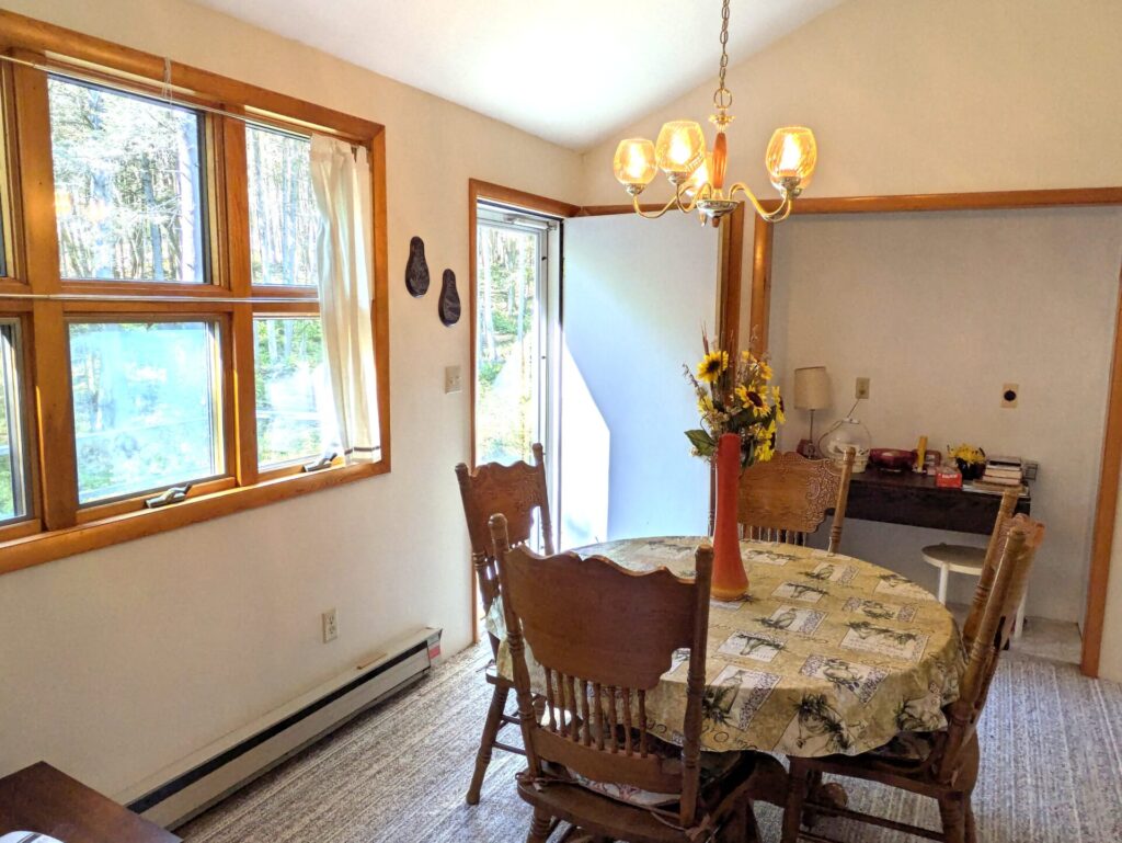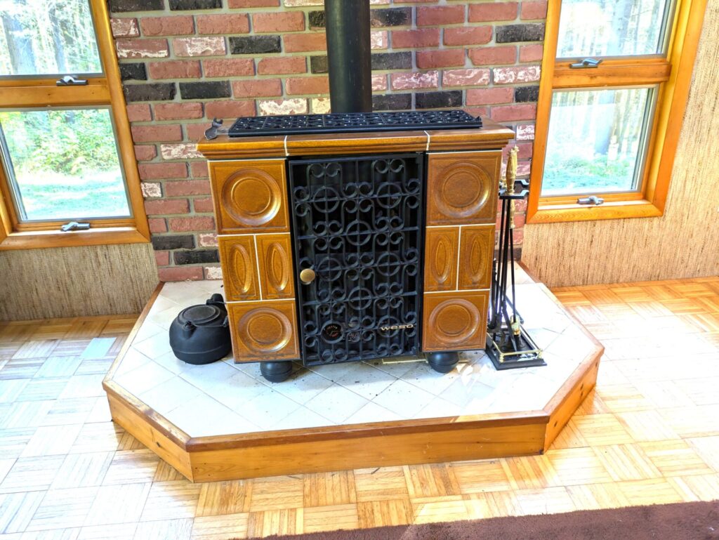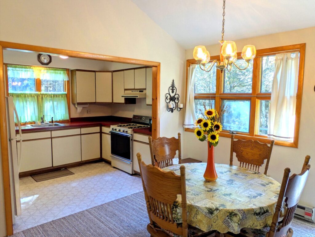 This approx. 1,100 sq ft home offers a unique and inviting design. The heart of the residence is the dramatic, sunken living room featuring cathedral ceilings and abundant skylights, creating a bright, airy gathering space. Cozy up next to the comfortable Weso ceramic multi-fuel woodstove during cooler months.